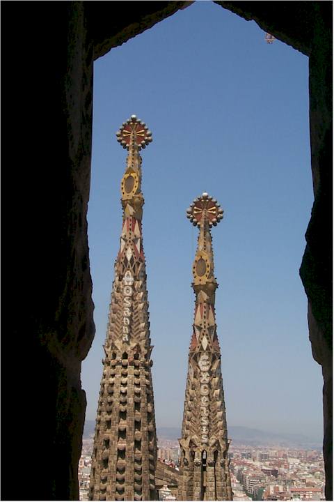 View from one of the cathedral towers with neighboring towers and city beyond.
