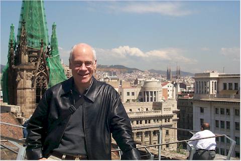 Charles Henderson on the roof of Barcelona's 14th century cathedral with Sagrada Familia in the background